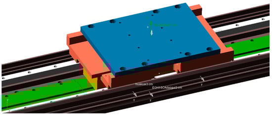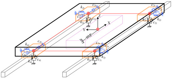 The feeding system joint is modeled as a spring-damped flexible connection, as depicted in Figure 6. The coordinate origin is taken as the center of mass of the workbench and the mover, with the flexible connection between the workbench and the guide simplified as a spring-loaded damping system in the Y and Z directions and a separate damping system in the X direction. The overall mass of the system comprises the mass of the table and the motor, while the stiffness is determined by the servo stiffness (primarily acting on the motor and proportional to the proportional gain of the servo system) and the tangential and normal stiffness of the contact between the guide and the slider. It is worth noting that the differences between individual sliders are ignored. Each slider is subject to damping in the X, Y, and Z directions, with the damping units acting on the center of the slider. It is assumed that the distance between the center of mass of the slider and the workbench and mover in the Z direction is negligibly small.