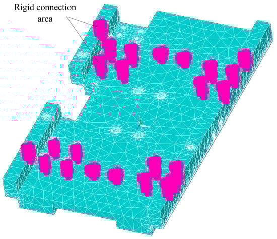 After analyzing the key components of the rigid body model using ANSYS finite element analysis software, it is determined that the flexible deformation of the guide rail and workbench has a significant impact on the overall performance of the feeding system. Therefore, the guide rail and workbench are modeled as flexible bodies while other parts are modeled as rigid bodies. The guide rail and workbench are meshed using ANSYS APDL, and finite element analysis is conducted to establish the rigid area of the connection between the flexible body and rigid body parts. Finally, a modal neutral file containing modal information is generated, which represents the flexible body file, as depicted in Figure 5.