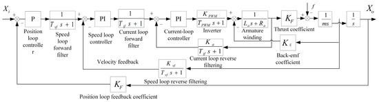 The control link of the linear motor feeding system adopts a triple-closed-loop control structure including current loop, speed loop, and position loop. The current loop uses a PI controller to improve the speed of the system and suppress internal disturbances in the current loop in time. The speed loop uses a PI controller to increase the resistance of the system to load disturbances and suppress speed fluctuations. The position loop uses a P controller to ensure the static accuracy and dynamic following error of the system for stable operation. The design of the three-loop structure and the quality of the controller directly affect the stability, accuracy, and speed of the entire servo system. The following premise assumptions are made for each of its link transfer functions, and then the control model of the linear motor feed servo system shown in Figure 8 is established.
