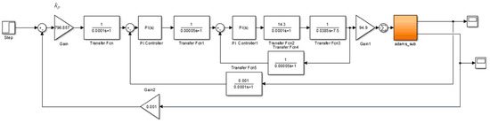 Where the transfer function of the current loop controller is , the transfer function of the velocity loop controller is , the transfer function of the position loop controller is , and are the gain and integration time of the current loop controller, respectively, and are the scale factor and integration time of the velocity loop controller, respectively, and is the proportionality factor of the position loop proportional controller. The values and meanings of the other parameters in the control model are shown in Table 2.