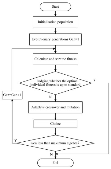 The genetic algorithm is a technique that simulates the natural mechanisms of biological genetic evolution to optimize and adjust parameters, using fitness as an evaluation criterion. The basic idea behind the genetic algorithm is to generate and encode a population of individuals. These individuals are then selected by the fitness function, and new individuals are generated by replication, crossover, and mutation operations. The iterative process continues until the optimal solution is obtained and the optimization objective is achieved. The traditional genetic algorithm adopts a fixed crossover rate and variation rate, which has suitable robustness for solving general global optimization problems. However, it may suffer from issues such as “premature convergence” or slow convergence speed when synchronously optimizing control parameters. Adaptive genetic algorithms differ from traditional genetic algorithms in that the crossover and variation probabilities are automatically adjusted based on the fitness function, which significantly improves computational efficiency and accelerates the convergence of the algorithm [22].