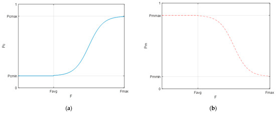 (a) The variation curve of crossover rate with fitness. (b) The variation curve of mutation rate with fitness.