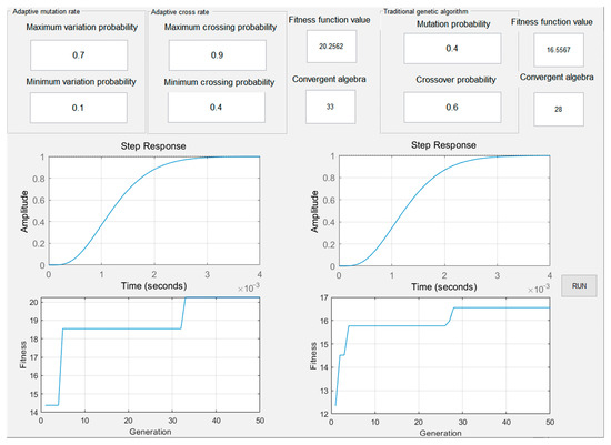 The adaptive crossover rate and variation rate have varying maximum and minimum values. The crossover rate and variation rate in the traditional genetic algorithm are the average values of those in the adaptive genetic algorithm. After running 100 repetitions with different parameter configurations, statistical analysis showed that the mean adaptation values obtained using the adaptive genetic algorithm (18.436) were better than those obtained using the conventional genetic algorithm with fixed variance and crossover rate (16.896), indicating that the adaptive genetic algorithm is more effective in finding strong individuals. The comparison of step response and fitness obtained by using the adaptive genetic algorithm and traditional genetic algorithm to optimize the PID parameters of the servo control system are shown in Figure 15 (the result of a single run of the program), which shows that the use of the adaptive genetic algorithm can avoid the algorithm falling into local convergence, and the final fitness value shows that the adaptive genetic algorithm has a stronger search ability.