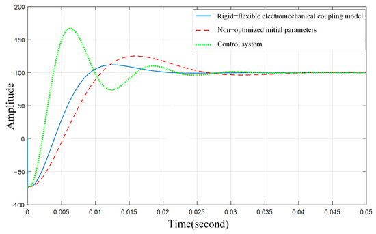 Step response of rigid–flexible electromechanical coupling model optimized by adaptive genetic algorithm, nonoptimized control system, and optimized control system.
