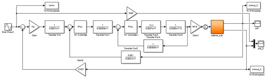 A joint simulation of ADAMS and MATLAB is conducted based on the previously established rigid–flexible coupling model and servo control system using MATLAB/Simulink. During the simulation, both workbench displacement and velocity are outputted by the mechanical system and used as feedback inputs to the control system. Meanwhile, the control system outputs the electromagnetic force, which is utilized as an input to the mechanical system. Finally, data exchange is carried out through the data interface to realize the joint simulation. The resulting model is illustrated in Figure 11 and Figure 12.