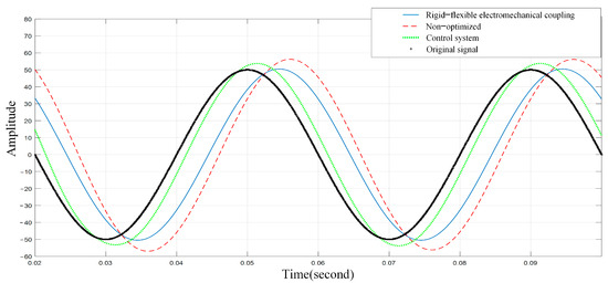 These three sets of control parameters are substituted into the electromechanically coupled Simulink simulation model shown in Figure 17. After applying a sinusoidal signal with a frequency of 25 Hz and an amplitude of 50 mm as input, the resulting output signal of the system is displayed in Figure 18. The results show that the nonoptimized system has a large sine signal following error and a significant peak overshoot; the response curve of the sine signal obtained by optimizing the control system has a faster response speed, but the peak of the response curve is overshoot. The system obtained by optimizing the rigid–flexible electromechanical coupling model with a non-linear adaptive genetic algorithm has no peak overshoot and exhibits a faster response speed. This optimized system meets the feeding requirements and demonstrates a superior optimization effect.
