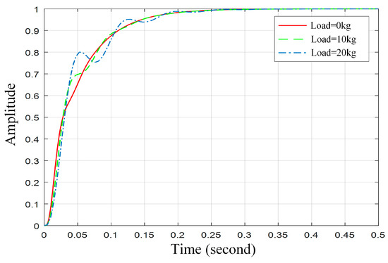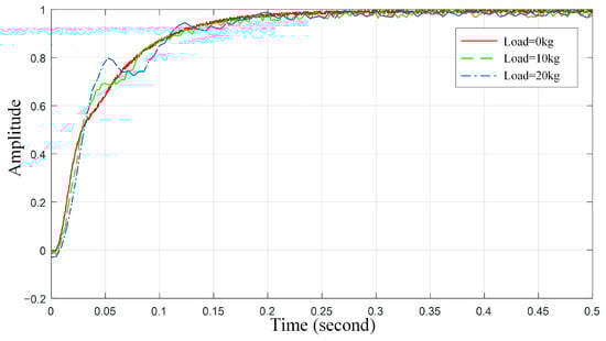 The rigid–flexible electromechanical coupling model of the linear motor feeding system is used to simulate the step response of the workbench displacement under different loads, and the simulation curve is shown in Figure 20. In addition, the data collected from the experiments are analyzed, and the response curves of the feeding system displacement in the feed direction under different loads are plotted as shown in Figure 21, which shows that the displacement response of the feeding system gradually becomes slower, and the vibration increases as the load increases. The difference between the simulated and experimental results is comparable. Although the time to stabilization is slightly shorter than the experimental results and the amplitude of the vibration is reduced compared to the experimental data, the pattern obtained from the simulation is consistent with that obtained from the experiments, demonstrating the correctness of the rigid–flexible electromechanical coupling model.