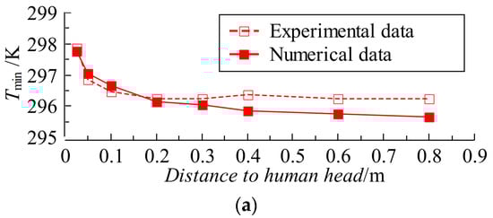 Figure 5 compares the calculated results of the numerical method in this work and the experimental results in Reference [35]. Table 3 shows the percentage deviations between the corresponding numerical and experimental results. As shown in Figure 5a, the temperature calculated by the numerical method in this work has the same trend and similar value as the experimentally measured temperature in Reference [35], and the maximum deviation between them is 4.4%. As shown in Figure 5b, the relative humidity distribution trend calculated by the numerical method in this work is also the same as that of the experimentally measured relative humidity distribution trend in [35], and their values are also similar with a maximum deviation of 8.5%. Therefore, the numerical method for simulating the temperature and humidity distribution characteristics inside a certain space established in this study has relatively high reliability and accuracy.
