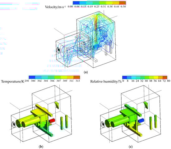 Distribution characteristics of velocity, temperature, and humidity in the spring-loaded actuator: (a) velocity; (b) temperature; (c) humidity.
