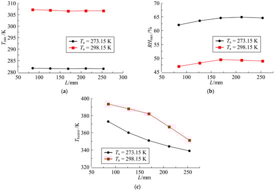 Effect of heater length on temperature and humidity distributions inside the spring-loaded actuator: (a) minimum temperature; (b) maximum relative humidity; (c) maximum temperature of heater surface.