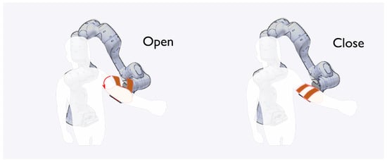The soft bending actuators are utilized as straps to envelop the user’s limb by applying air pressure and to exert adequate pressure on the soft tissues, thereby mitigating any potential safety or comfort issues. The left configuration illustrates the user donning their arm onto the interface, whereas the right configuration depicts the user being fully secured to the interface after the straps are actuated by pressurized air.