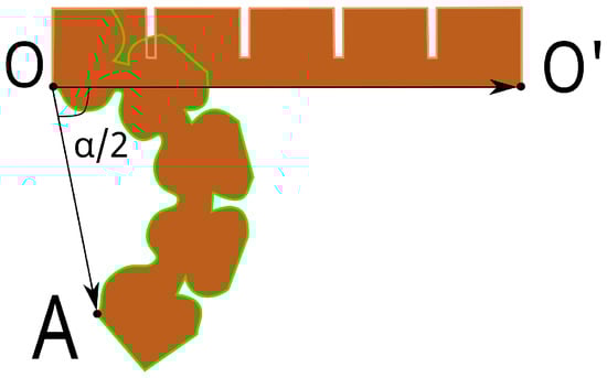 - Bending angle: To characterize the bending angle, the displacement over time of 2 nodes, located at each end of the actuator, was monitored from 0 kPa to the desired pressure. Using the vector in the initial state and the vector in the final state , where O is the origin of the vector, the coordinate of the point at the tip of the actuator in the initial state, and A the coordinate of the node at the other end of the actuator in the final state (see Figure 2), the bending angle was calculated according to the following Equation (2):