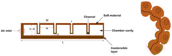 The principle of PneuNets is depicted in Figure 4. The design consists of a main body where all connected chambers are uniformly inflated with air. A limiting strain layer is included in the bottom part to prevent the soft material from deforming axially and to force it to bend instead. While an extra layer of soft material is sufficient for some designs, this solution cannot be considered if maximum compliance is desired at the bottom of the actuator. Furthermore, while some researchers have employed multi-material designs utilizing both stiffer and more elastic materials [20], for the sake of simplicity, we opted to use only one material. Paper material is often used as a strain-limiting layer in other designs, but it tends to break faster due to fatigue after several cycles of inflation than woven fabric [21]. Therefore, in this design, inextensible fabric was used to counteract the fatigue life of paper, and we hypothesize that it maintain compliance at the bottom of the actuator as seen at the right of the figure. The fabric was tested in tension using the ASTM D5034 standard to obtain its Young’s modulus, and the Poisson’s ratio was determined by averaging typical textile ratios. The density was calculated by scaling the fabric sample of known geometry and dimensions to find the volume. To provide stiffness inside the design to hold the straps in a specific initial position, small strips of PLA (160 mm × 6 mm × 1 mm) were inserted in the bottom part of the actuator just below the strain-limiting fabric.