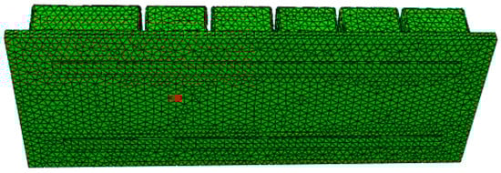 - Inflation of the bottom wall of the chambers: The calculation is analogous to that of the bending angle. However, in this case, we monitored the displacement of the node located at the middle of the designated chamber’s bottom wall (indicated by a red dot in Figure 5). As the inflation does not act along a single axis (the actuator is bending and deforming in the XY plane, which is defined by the plane formed by the points O, , and A in Figure 2, with Z being perpendicular to this plane and pointing towards the reader), the coordinates of the top and the bottom walls were monitored to compute the norm of the vector created from both coordinates independently of the actuator’s orientation.