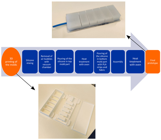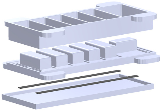After identifying a model that closely satisfies the requirements specified in Table 1, the fabrication process takes place. The actuator was cast in 3D-printed PLA molds (Ultimaker B.V., Utrecht, The Netherlands), as depicted in Figure 6. An exploded view of the different molds can be seen in Figure 7. The molds were divided into two parts: a top mold to create the PneuNets and chambers, and a bottom mold to close the actuator and insert the fabric layer and PLA strips. After printing, the soft material Ecoflex 00−30 (Smooth−on, Macungie, PA, USA), that was chosen as the soft material since it meets best the requirements defined (see Section 3.1), was mixed for 3 min using the two parts A and B with a ratio of 1:1 according to the datasheet. After the two silicone parts were mixed, the mixture was placed in a vacuum chamber for 10 to 15 min to remove excessive air bubbles that could create weak spots in the design. Afterward, the silicone was poured into the top mold as the first step and placed in an oven at around 50 °C to decrease the curing time by half (2 h instead of 4 h). The reason we did not go higher in temperature is that the maximum allowed temperature for the PLA molds is approximately 50 °C, limiting our range of temperature for good operation. Whenever the top mold was cured, the same process was performed for the bottom mold. As an additional step, the pouring process included the insertion of the PLA strips after a first layer of Ecoflex 00−30 was applied to the bottom mold, and the insertion of the fabric after a second layer of Ecoflex 00−30 was poured above the PLA strips. Finally, the top mold part was assembled with the bottom part after adding a third and last layer of silicone above the fabric with again a heat treatment to speed up the curing process.