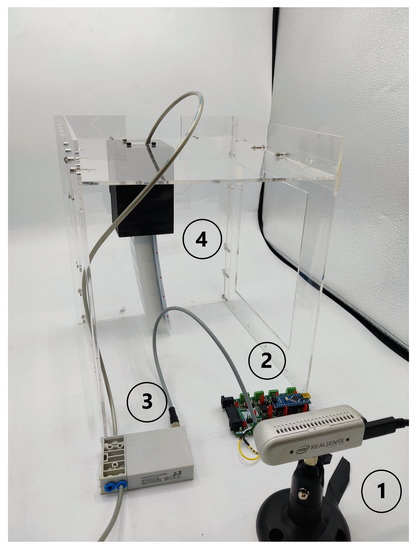 The purpose of the experimental protocol is to determine whether the soft actuator designed in the Abaqus simulation environment matches the real model. To achieve this, a test bench similar to the one presented by Ferrentino et al. [23] was built, which enables controlling the inner pressure and the characterization of the actuator using motion tracking (Figure 8) thanks to an RGBD camera installed to track the position of red markers on the actuator during bending (Number 1 in Figure 8). The test bench consists of a 3−way proportional pressure regulator VEAB−L−26−D7−Q4−A4−1R1 (Festo, Esslingen am Neckar, Germany—Number 3) where the inlet is connected to compressed air available in the lab and where the outlet is connected to the actuator (Number 4) with a PCB (Number 2 in Figure 8). The PCB serves to control the valve, which is equipped with a pressure sensor that is monitored by the PCB. The primary function of the PCB is to regulate the setpoint of the pressure, thereby determining the pressure–time profile to be applied. The actuator is hanging from a 3D-printed interface attached to a plexiglass box measuring 30 cm × 50 cm × 50 cm. The FEA model, which includes the Yeoh model, was validated by comparing the position of the markers on the actuator with the selected nodes in the FEA simulation and by calculating the bending angle between them. To estimate the position of the markers, the camera was first calibrated using the Zhang calibration method [23], after which the images from the camera were processed through a segmentation algorithm that highlights the red markers in white against a black background. The resulting frames were then sent to a clustering algorithm, which recognizes the number of markers on the pneumatic actuator and calculates their centroid positions using the camera calibration.