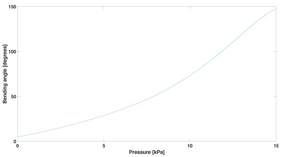 Bending angle retrieved after post-processing in Matlab. The behavior of the actuator shows a linear response from 0 to 5 kPa explained by the dominance of the PLA over the bending behavior of the actuator and a non-linear response for remaining pressure explaining the compliant behavior taking over the PLA strips. The maximum bending of the actuator reaches 150°.