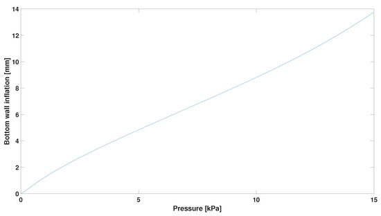 Figure 11 shows the inflation of the bottom wall using the method explained in Section 2.3.2, which is meant to be in contact with the soft tissues. Naturally, compared to the bending angle where there was an initial bending effect with no pressure, there is no inflation when no pressure is applied. When applying pressure, the bottom wall inflates until 1.4 cm, which is enough to efficiently compress the soft tissues. The approximated linear behavior of the inflation, without any plateau at high pressure, suggests that the bottom layer still has room for further deflection, potentially allowing for higher pressure demands. This inflation is a crucial outcome of the design as it determines the interaction of the actuator with the soft tissues of the user, as shown in Figure 3. High inflations can lead to popping out the PLA strips and the fabric layer located at the bottom of the actuator as well, whereas too low inflation may not interact sufficiently with the user’s soft tissues.
