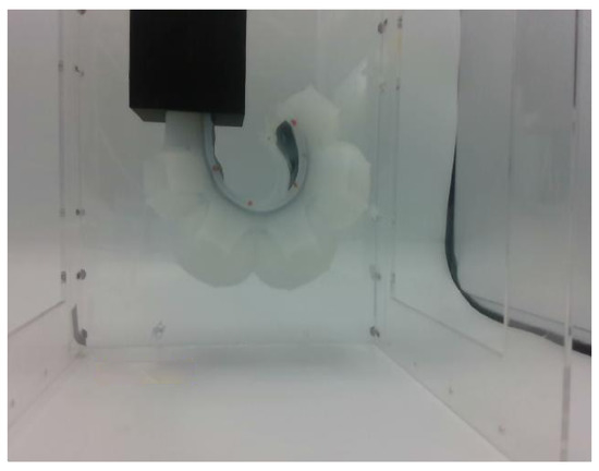 Figure 12 displays the final configuration of the actuator at 15 kPa, captured by the RGB camera to detect and isolate the red dots in order to determine the bending angle. The experimental conditions encompassed quasi-static conditions for the whole experiment. Quasi-static conditions promote stability and safety in our design by neglecting dynamic effects and simplifying analysis through the assumption of slow changes, in contrast to transient behavior. The resemblance in the behavior between Figure 9 and Figure 12 is noticeable. The PLA strips and fabric layer can withstand the stresses created from the bending motion, as shown by the simulation.