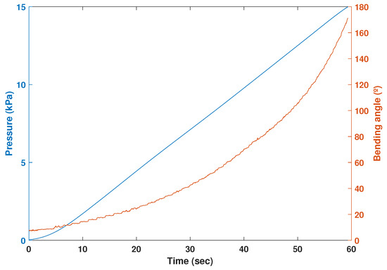 As per the simulation, the pressure, depicted in blue, rises linearly from 0 to 15 kPa in 60 s resulting in a rate of 0.25 kPa/s as shown in Figure 13. The bending angle in red begins gradually, similar to the pressure response. A noticeable response time can be observed at the beginning of the experiment, likely due to possible friction inside the tube connecting the air source to the actuator and the opening of the valves. Following this initial response time, the controller successfully achieves a controlled linear flow rate. Subsequently, the bending angle intensifies as the pressure steadily increases over time.