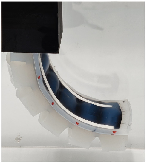 As shown in Figure 14 and as expected, when the actuator is pressurized, the air not only deforms the chambers to create a bending effect, but also applies pressure to the bottom wall of the actuator, where they will interact with soft tissues of the user’s arm when inserted into the physical interface. Moreover, the PLA strips appear to not conflict with the inflation of the bottom wall if properly placed. Finally, the hypothesis presented in Section 2.2 regarding the fabric layer at the bottom of the actuator, which allows for stiffness along its length and compliance in its normal direction, was confirmed by the simulation results and once again during the experiment.