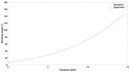Figure 10 shows the bending performance of the actuator using Equation (2) with a pressure of 15 kPa that increases linearly over time. At the beginning of the simulation, where there is no pressure in the system, the actuator bends due to the effects of gravity and its own weight, along with its hyperelastic properties. Next, a linearly increasing pressure is applied to actively bend the actuator. The actuator exhibits a linear response within the pressure range of 0 to 5 kPa, which is attributed to the predominance of PLA over the actuator’s bending behavior. However, for pressures beyond this range, the actuator shows a non-linear response due to the compliant behavior taking over the PLA strips. The maximum bending angle obtained from the FEM simulation is 150 degrees, which is sufficient to enclose the limb in the configuration proposed in Figure 3.