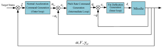 In this section, we design the control input so that the interception strategy converges to the neighborhood of zero in the presence of unknown target maneuver, missile normal acceleration constraint, and missile actuator saturation. Combined with Equations (7) and (12), it is more appropriate to adopt a three-loop control structure to complete the integrated controller design. The control structure diagram of the integrated guidance and control design is shown in Figure 2. The outer loop is designed to drive to the neighborhood of zero using the normal acceleration command as a virtual control input. The intermediate loop is used to make the actual normal acceleration track the normal acceleration command , using the pitch angle rate command as a virtual control input. Similarly, the inner loop is used to make the actual pitch rate track pitch rate command , using the elevator deflection as the control input.