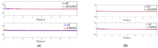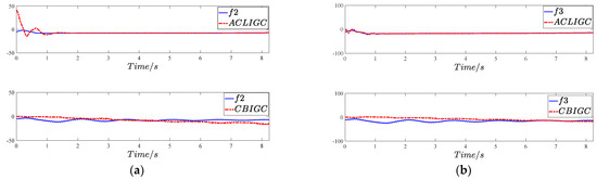 Moreover, according to Table 3 and Figure 11a, the constraint of will not be violated. The final miss distances for ACLIGC and CBIGC are shown in Table 4, and the curves of are given in Figure 11b. It is clear that the ACLIGC proposed in our study obtains a smaller value of to realize direct hit interception. The contrast curve in Figure 12a shows that the elevator deflection amplitude of ACLIGC is , while that of CBIGC is . Meanwhile, the time response curve of the elevator deflection corresponding to the ACLIGC is smoother. Similar to scenario 1, ACLIGC achieves higher estimation accuracy for the uncertainties and time-varying disturbance, as indicated by Figure 12b and Figure 13.