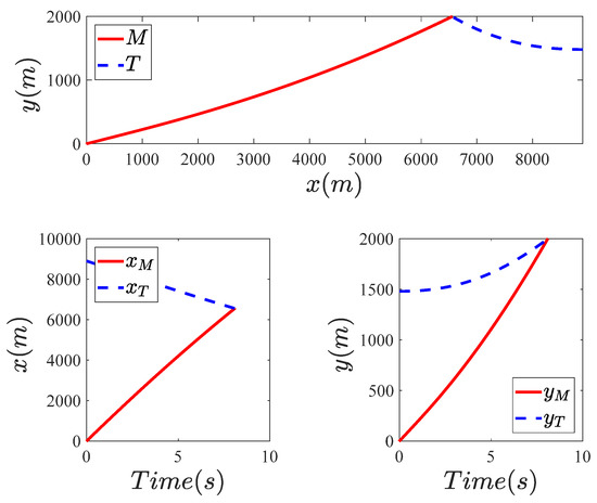 Figure 4, Figure 5, Figure 6, Figure 7 and Figure 8 show the simulation results when the maneuvering acceleration of the target is constant. It can be seen that the trajectories of the missile and target and the and coordinates of the missile and target are presented in Figure 4.