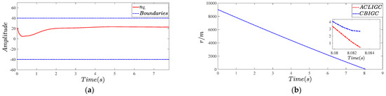 The trajectories of state variables for the IGC system such as intercept strategy ξ and pitch angle rate q are illustrated in Figure 5. It can be seen from Table 3 and Figure 6a that nL always maintains in the constrained area. The final miss distances of different methods are shown in Table 4, and the time response of range along the LOS is presented in Figure 6b. Table 4 and Figure 6b indicate that the ACLIGC proposed in our study has a smaller final miss distance compared with another value.