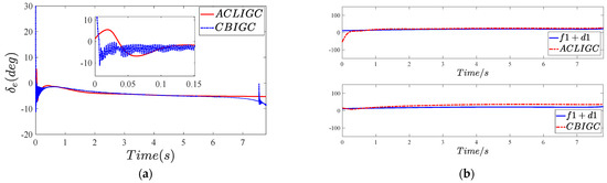 (a) The time responses of elevator deflection in scenario 1; (b) ACLIGC and CBIGC to estimate in scenario 1.