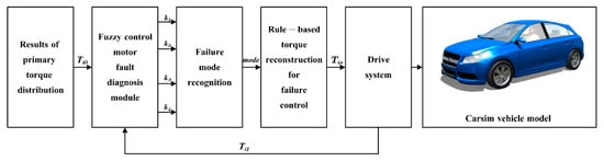 Fault diagnosis provides the theoretical basis for failure control, and precise and reliable identification results are essential for failure control. Reference [7] proposes a fault diagnosis method for distributed-drive electric vehicles based on an online estimator of the tire–road friction coefficient. This method can work well even in the presence of interference and modeling errors and has good robustness. Reference [8] proposes a fault diagnosis method based on actuator redundancy. By comparing the actual motor torque with its nominal value, motor faults can be detected more accurately, and faulty motors can be assessed and located. Reference [9] designs a distributed-drive electric vehicle fault detector based on the Extended Kalman Filter (EKF) wheel hub motor, which can observe hub motor parameter changes caused by faults and identify motor faults. Reference [10] applies differential algebraic methods to diagnose and isolate faults by establishing a motor model. After identifying the faulty motor through fault diagnosis, an effective failure control algorithm needs to be designed to reconstruct torque and fully utilize the advantages of multiple actuator redundancy, ensuring that the vehicle can track the driver’s expected trajectory even if the drive system fails. Reference [11] proposes to compensate for the loss of the faulty motor by using an uncompromised one but lacks consideration of actual working conditions. Reference [12] designs a fault control strategy for distributed-four-wheel drive electric vehicles based on sliding mode control and proposes the use of the motor weight matrix to characterize whether it is working properly. Reference [13] applies fault factor limits to the faulty motor and reconstructs the torque of each wheel motor. Reference [14] proposes a distributed-drive electric vehicle drive failure control method based on power and stability to cope with different failure modes and driving conditions. Reference [15] classifies different failure situations into two categories: the deceleration and stopping type and the maintaining speed type. For the latter, the method suggests shutting down the opposite motor of the faulty motor and using fuzzy control to maintain the expected driving trajectory of the vehicle. References [16,17] propose a hierarchical failure control strategy, which consists of signal acquisition, logic recognition, and failure control layers. Reference [18] designs a torque distribution optimization strategy based on direct lateral force control on top of the conventional drive system failure control to ensure optimal overall performance.