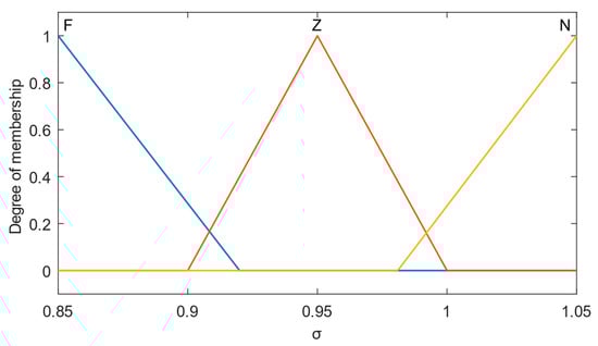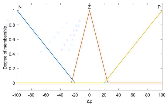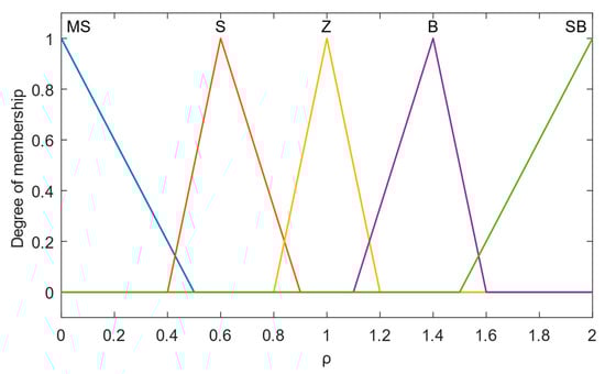 A proactive fault diagnosis tool is designed based on fuzzy control, using ρ and its rate of change, ∆ρ, as input variables and σ as the output variable to evaluate the motor’s operating status at this moment. First, the variables are fuzzified, and the fuzzy sets for the input and output variables are defined. The range of ρ is [0, 2], divided into five fuzzy sets. The range of ∆ρ is [−100, 100], divided into three fuzzy sets. The range of the output variable σ is [0.85, 1.05], also divided into three fuzzy sets. The partition of the fuzzy variable fuzzy sets is shown in Table 1. The membership functions of each variable are shown in Figure 2, Figure 3 and Figure 4.