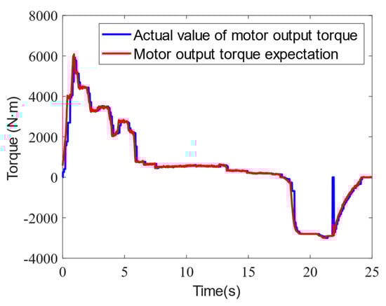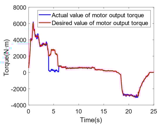 It can be observed that the actual and expected values of the output torque of the drive motor are not the same, as small deviations exist under normal circumstances. Fuzzy control can ignore these deviations and accurately determine the working status of the motor. Moreover, at approximately 22 s, the motor experiences torque loss due to communication interference and other factors. This situation is brief, and the motor quickly returns to normal operation. To address this issue, the output results of the fuzzy controller need to be cumulatively analyzed. If the number of fault judgments within a given period exceeds the set threshold, the motor is considered to have failed, and it will be deactivated for isolation treatment. The determination period and threshold can be adjusted according to the real-time requirements of the vehicle.