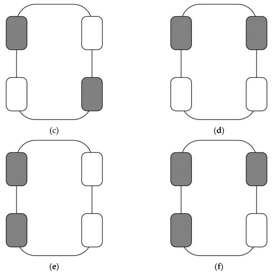 Drive system failure mode diagram (the grey-colored wheel in the figure represents the wheel driven by the failed motor): (a) Normal operating conditions; (b) Single-motor failure; (c) Dual-motor failure: opposite shaft and opposite side; (d) Dual-motor failure: coaxial; (e) Dual-motor failure: same side; (f) Three-motor failure.