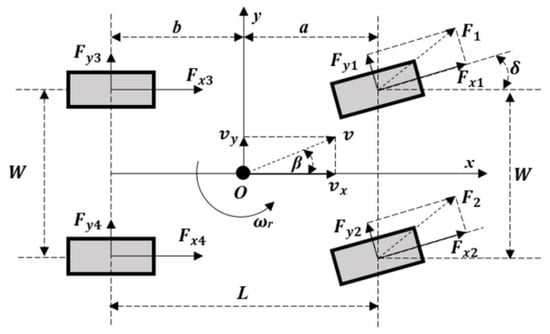 In addition to normal driving and situations that require immediate braking, this article will propose torque reconstruction control strategies based on vehicle stability for failure modes (2)–(4). For this purpose, a seven-degrees-of-freedom distributed-dive vehicle model shown in Figure 7 is considered, which includes the longitudinal and lateral movement of the vehicle, the yaw motion around the z-axis, and the rotational motion of the four wheels. In the dynamic equation of the model, W is the wheelbase, a is the distance from the front wheel to the center of gravity, b is the distance from the rear wheel to the center of gravity, r is the rolling radius of the wheel, and δ represents the steering angle of the front wheel. ij = fl, fr, rl, rr respectively represent the left front wheel, right front wheel, left rear wheel, and right rear wheel.