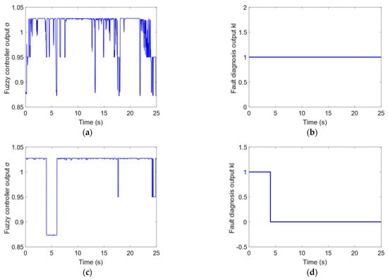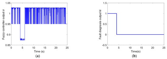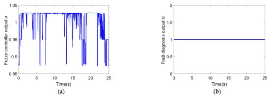Robustness simulation results of the drive system fault diagnosis: (a) Fuzzy controller output σ; (b) Fault diagnosis output kl.