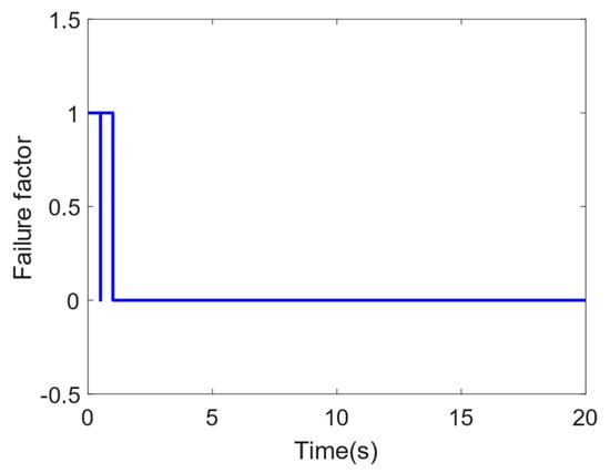 To verify the control effect when a single motor fails, verification was conducted separately for the straight-line driving condition and the single-lateral-lane-shift driving condition. The simulation control group did not deal with the failure situation. The parameters of the two simulation conditions are shown in Table 3. The left front wheel drive motor failed, and the fault factor is shown in Figure 11. A brief torque loss occurred at 0.5 s, and the motor failed for a long time after 1 s.