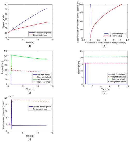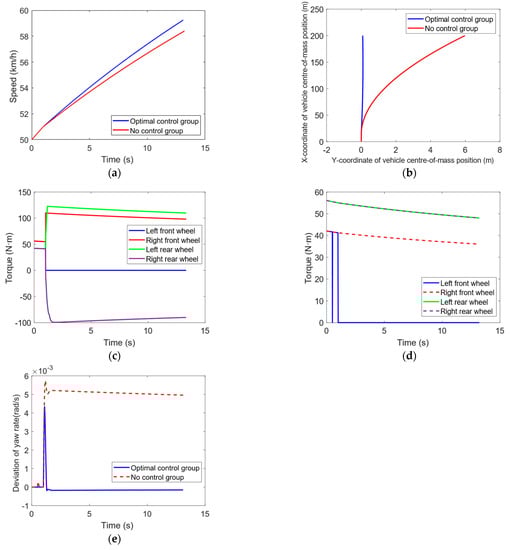 Simulation results for single-motor failure straight-line driving condition: (a) vehicle speed; (b) vehicle trajectory; (c) optimal control of individual wheel torques; (d) no control of individual wheel torques; (e) deviation in yaw rate.