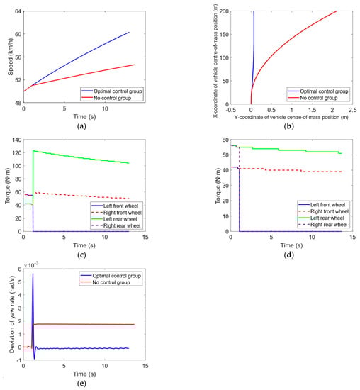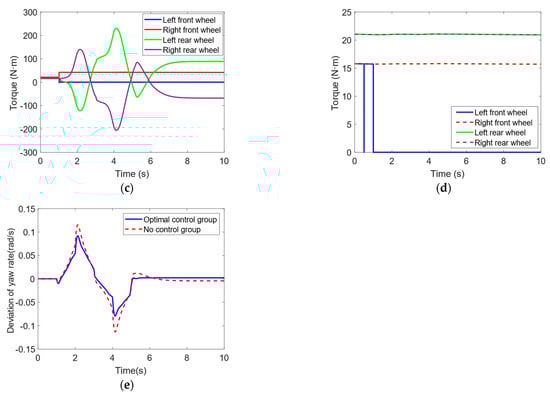 The simulation results of the single-motor failure single-lane-shift condition are shown in Figure 14. From Figure 14a, it can be seen that the final speed of the optimized control group is 50.55 km/h, while that of the uncontrolled group is 50.27 km/h. Both groups of vehicles can maintain their speed almost unchanged during the driving process. In Figure 14b, the maximum lateral offset of the optimized control group during the single-lane-shift process is 0.67 m compared to the normal driving, which can keep the expected trajectory of the single-lane shift, while that of the uncontrolled group is 1.01 m, and the trajectory has already deviated from the expected single-lane-shift trajectory. The lateral deviation will gradually increase with time. Figure 14c,d show the torque output of each wheel of the two groups of vehicles. The optimized control group detects the failure of the left front motor, isolates and shuts off its power output, and adjusts the torque of the remaining motors to ensure driving stability. Figure 14e shows the deviation in the yaw rate of the two groups of vehicles during driving, with an average value of 0.016 rad/s for the optimized control group and 0.022 rad/s for the uncontrolled group. Adopting failure control can improve the yaw stability of the vehicle during turning.