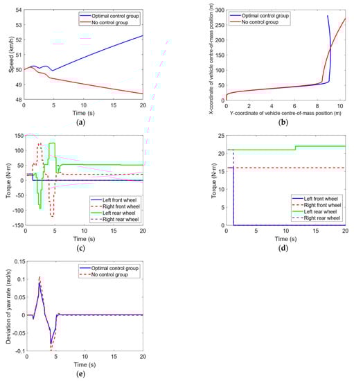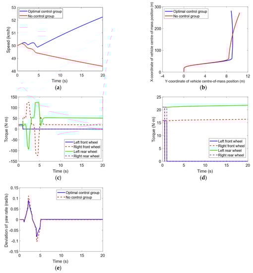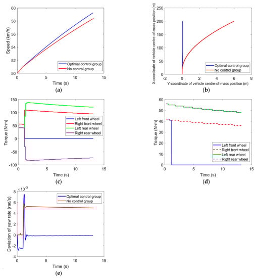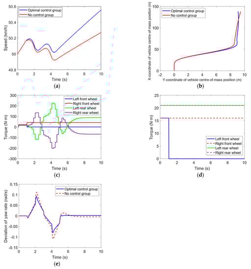 Simulation results of double-motor failure on the opposite side of the opposite axis under single-lane-shift condition: (a) vehicle speed; (b) vehicle trajectory; (c) optimal control of individual wheel torques; (d) no control of individual wheel torques; (e) deviation in yaw rate.