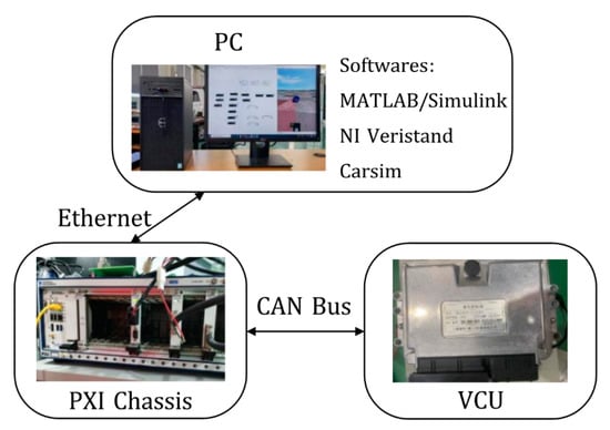 To further verify the effectiveness of the failure control strategy in an actual vehicle control unit (VCU), HIL testing was conducted. In this paper, a hardware-in-the-loop simulation platform based on NI PXI and CARSIM RT was constructed, as shown in Figure 17. The platform is seamlessly integrated with the Simulink control model in SIL for co-simulation. It consists of three main parts: the host computer, the tested VCU hardware, and the industrial PC cabinet equipped with real-time processors and digital-to-analog input and output boards.
