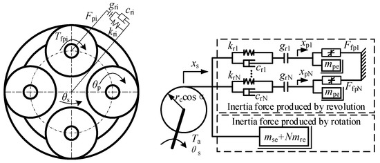where Tc is the static friction torque coefficient of the screw–nut pair, Tv is the viscous friction torque coefficient of the screw–nut pair, and θ is the angle of the screw. The planetary flywheel’s nonlinear dynamic model is shown in Figure 2 by the dotted line. Figure 3 shows an additional depiction of the planetary flywheel model. In the model, θs represents the planetary flywheel carrier’s rotation angle, xs represents the displacement of the planetary flywheel carrier along the action line, θp represents the planetary flywheel’s rotation angle, xp represents the displacement of the planetary flywheel along the action line, N represents the number of planetary gears, mpe represents the equivalent mass of the planetary gear rotation, mre represents the equivalent mass of the planetary gear revolution, and mse represents the equivalent mass of planetary flywheel carrier rotation. kri denotes the meshing stiffness of the meshing gear pair along the action line, cri the gear pair’s meshing damping coefficient, and gri the gear backlash. The meshing force between the planetary gear and the outer ring gear is represented by Fpi, and its equation is illustrated in Equation (3).