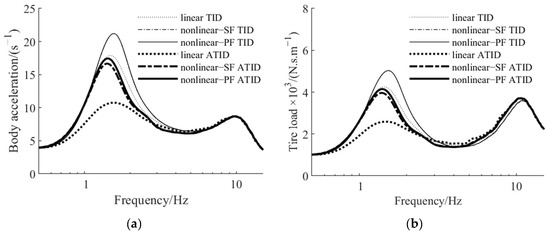 ATID suspension amplitude–frequency characteristics with different inerter actuator models: (a) sprung acceleration, (b) tire load.