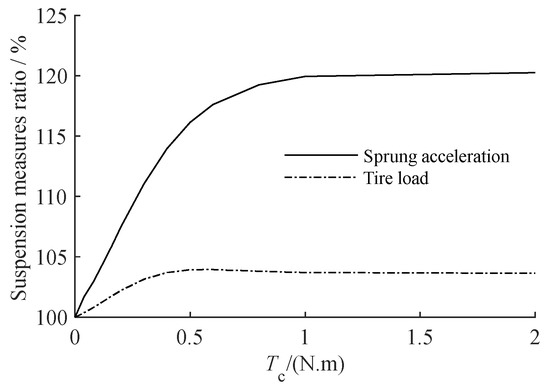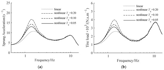 The static friction torque coefficient of the screw–nut pair Tc is the quantity that defines the static friction of the screw–nut pair. We set the compensation coefficient r = 300 kg and raised Tc from 0 to 2 N‧m. Figure 8 depicts the relationship between sprung acceleration, tire load measure, and screw–nut static friction, where the ordinate shows the ratio of the nonlinear suspension measure value to the same measure value of the linear suspension. Figure 9 depicts the amplitude–frequency characteristics of vehicle sprung acceleration and tire load when Tc is 0.05 N‧m, 0.1 N‧m, and 0.2 N‧m.