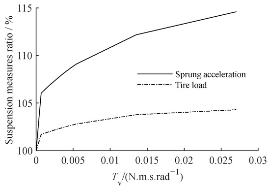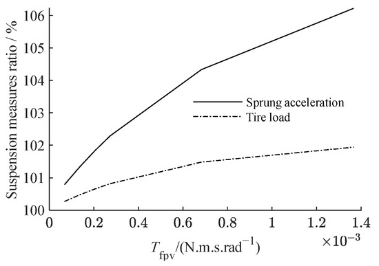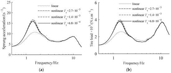 The viscous friction torque coefficient of the screw–nut pair Tv is the key parameter that defines the viscous friction of the screw–nut pair. We set the compensation coefficient r = 300 kg and increased Tv from 0 to 0.03 N‧m. Figure 10 depicts the relationship between the sprung acceleration, the tire load measure, and the ball screw viscous friction. Figure 11 shows the amplitude–frequency characteristics of sprung acceleration and tire load when Tv is 6.8 × 10−4 N‧m‧s‧rad−1, 1.4 × 10−3 N‧m‧s‧rad−1, and 2.7 × 10−3 N‧m‧s‧rad−1.
