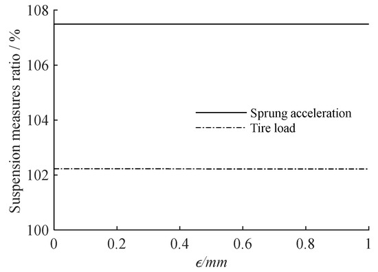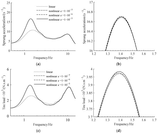 We set the compensation coefficient r = 300 kg and increased the screw–nut pair clearance from 0 to 1 mm. Figure 12 depicts the relationship between the sprung acceleration, tire load measure and the screw–nut pair clearance. Figure 13 shows the amplitude–frequency characteristics of suspension and its partial amplification diagram at around 1.5 Hz when ε is 10−5 m, 10−6 m and 10−7 m.