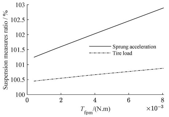 The static friction torque coefficient of the planetary gear to the axis of rotation Tfpm is the fundamental parameter determining the static friction of planetary gear. We set r = 300 kg as the compensation coefficient and increased Tfpm from 0 to 8 × 10−3 N‧m. Figure 14 depicts the relationship between the gear static friction torque coefficient and the value of each suspension measure, where the ordinate indicating the ratio of the measure of suspension with planetary flywheel to the suspension with typical single flywheel. Figure 15 depicts the amplitude–frequency characteristics of suspension and its partial amplification diagram at around 1.5 Hz when Tfpm is 8 × 10−4 N‧m, 4 × 10−4 N‧m and 8 × 10−5 N‧m.