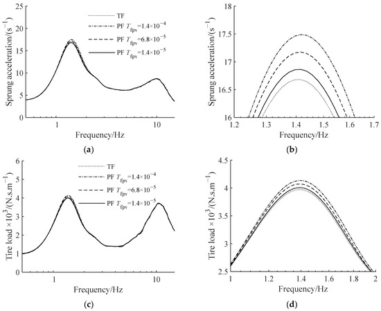 ATID suspension amplitude–frequency characteristics with different planetary gear viscous friction torque coefficients: (a) sprung acceleration, (b) partial amplification of sprung acceleration, (c) tire load, (d) partial amplification of tire load.