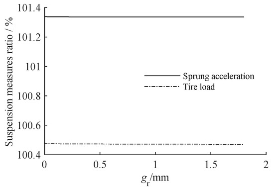 We increased the gear backlash gr from 0 to 2 mm and set the compensation coefficient r = 300 kg. Figure 18 depicts the relationship between gear backlash and the value of each suspension measure. Figure 19 depicts the amplitude–frequency characteristics of suspension and its partial amplification diagram at around 1.5 Hz when gr is 1.8 × 10−6 m, 1.8 × 10−5 m and 1.8 × 10−4 m.